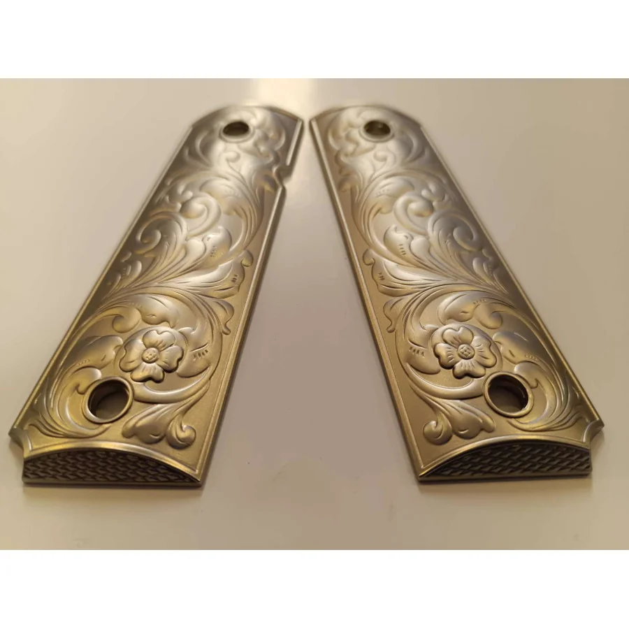 PLAQUETTE GRIP 1911 CUSTOM SCROLL ENGRAVING NICKEL MAT